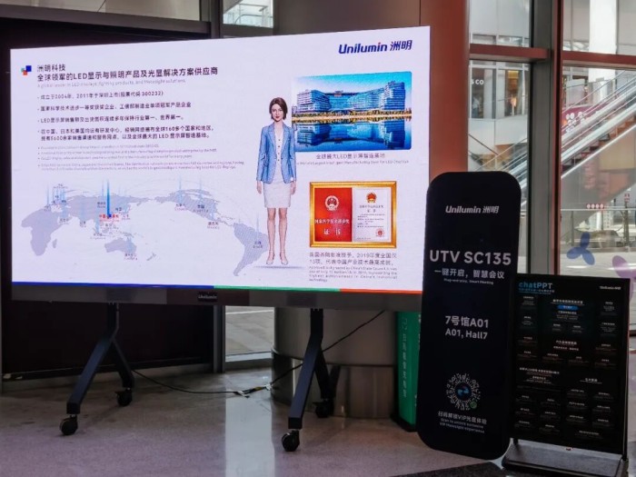 备受关注的ChatPPT方案(一种全新的AI讲解方式,数字人+PPT更有“人味”)也能在会议室实现联动。当数字人开始讲解PPT,它不再是复读机,而是能充分理解内容、生成专业讲解的“品牌代言人”。它甚至能与真人配合,化身“AI捧哏”,让商务演示生动有趣。