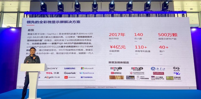 3月5日,2026中国国际LED产业发展大会上,赛富乐斯产品副总监谢蒙发表主题演讲,围绕R系列量子点芯片与量子点COB融合技术,解析其依托NPQD®专利实现的全角度高色准、宽色域等技术突破,该组合还具备低功耗、长寿命、高防护优势。谢蒙提到,该技术组合已落地多行业应用,尤其在CAVE屏领域优势显著:大视角色偏由常规15%降至不足3%,色彩精准度提升超5倍,打破常规显示瓶颈,为商显、XR、虚拟拍摄等领域树立新标杆,助力行业视觉升级与创新。
