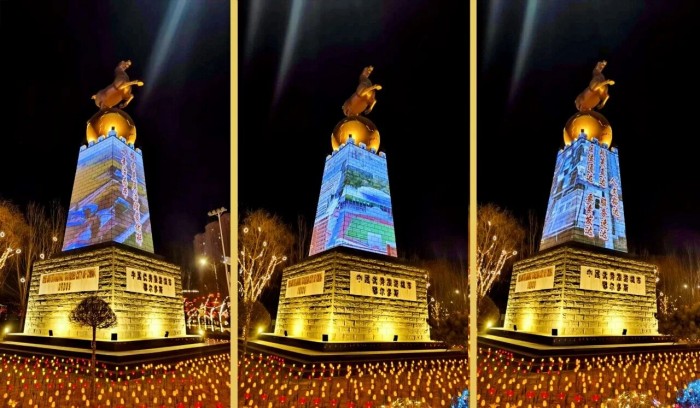 正值新春佳节,当“新春快乐”、“恭贺新春”的祝福语伴随着光影投射在雕像上,祥瑞之气跃然眼前,在“福马贺岁”的主题画面中,金色的骏马踏云而来,仿佛从天际奔腾而至,将草原人民的美好祝愿传递给市民及游客。