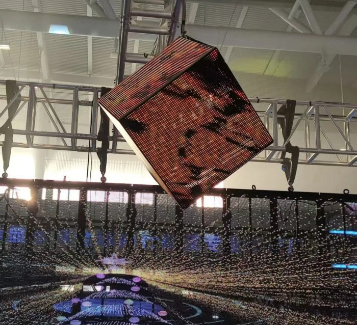 顶部搭载UT V2系列冰屏,配备大把手设计,兼顾快速吊装、高效作业与操作安全,在保持高通透与透光性能的同时,支持3500nits,是演唱会的通透之选。底部承载结构则选用MF系列超承重专业地砖屏,以行业领先的结构强度与2.5吨单箱承重能力,确保整体装置的稳固与安全。