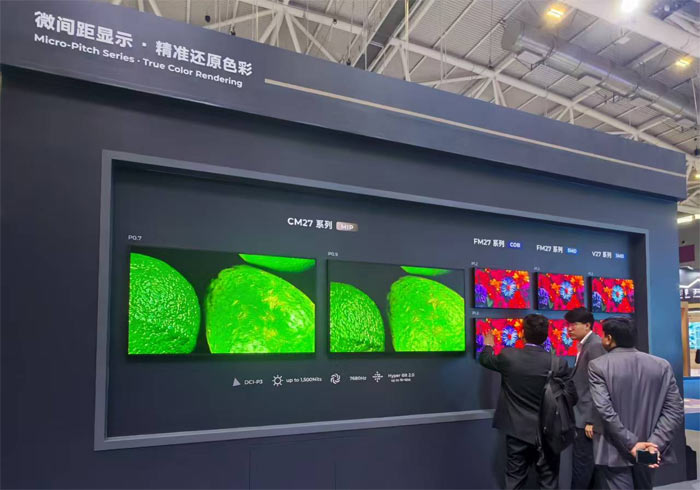 CM27系列室内小间距显示屏采用MIP0202技术,起灰亮度低至0.003nits,具备7680Hz刷新率,16bit位深;户外数字标牌采用16:9模组设计,具备4000nits高亮稳定,防水机箱,前后维护便捷等特点。