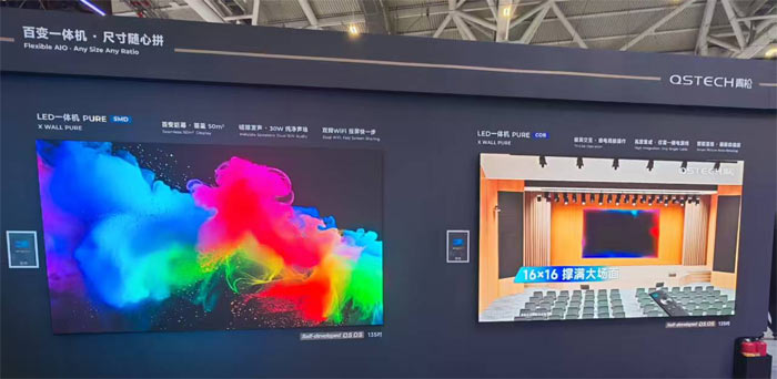 青松光电 LED 一体机 PURE 系列,以 “百变一体机・尺寸随心拼” 为核心设计理念,提供 SMD 与 COB 两种技术版本,满足不同场景的专业需求。PURE COB主打超薄空装与省电超静音,支持 16×16 大尺寸拼接,可轻松撑满大场面,具备高清直显、仅需一根电源线、即装即通等优势,适配报告厅、礼堂等对画面与空间要求严苛的场景。PURE SMD支持百变巨幕,最大可覆盖 50㎡,搭载 30W 纯净声场,双路 WiFi 实现投屏快一步,搭配自研 QS OS 系统,在大型展厅、活动现场等场景中,实现无缝拼接与高效展示。