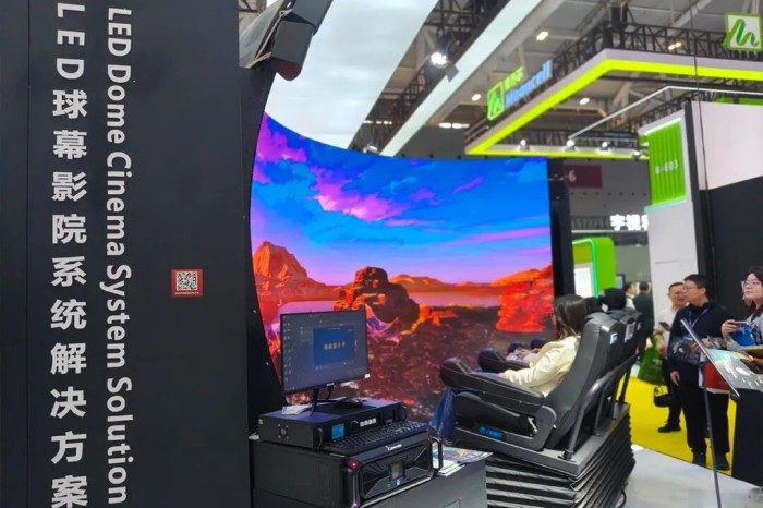 LED球幕影院系统&异形显示解决方案:现场搭建了约32m2內球幕,以球形映射及像素任意映射技术,确保异形屏画面线条丝滑、无变形撕裂,打造极致沉浸体验。