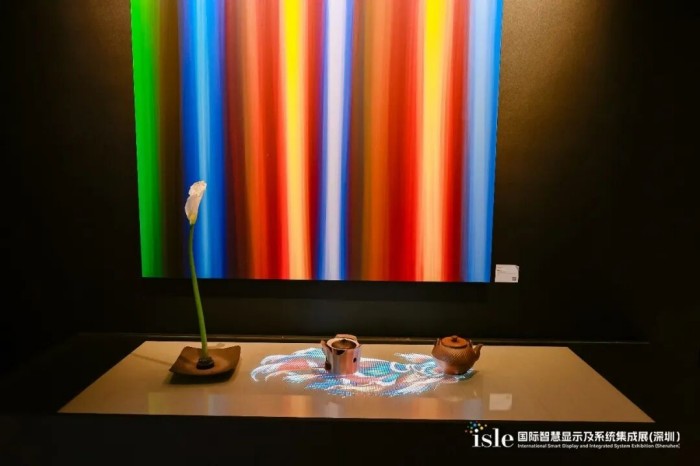 在展位现场“艺术照明空间”,纹理屏与爱加照明高端室内灯具、艺术家滕斐的画作交相辉映