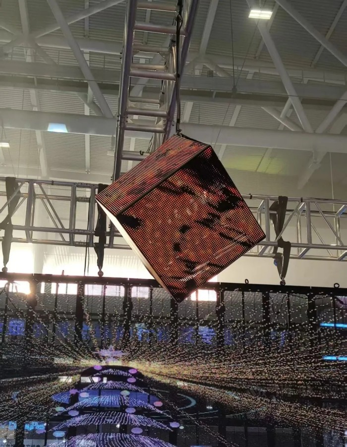 BY系列的多个尺寸产品兼容拼接,解锁无限创意造型。其中以BY系列产品打造的一个魔方造型悬挂在展位上空,这一别出心裁的造型设计,生动诠释了BY系列产品丰富的拼装功能,更通过魔方自身的形态语言,将产品的无限创意潜能直观呈现于观众眼前。光影流转间,BY系列出色的显示效果与结构灵活性相得益彰,展示产品在实际场景中的创意性。