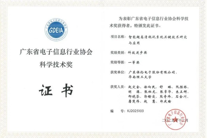 近日,备受瞩目的2025年度广东省工业软件学会科学技术奖、广东省电子信息行业协会科学技术奖评审结果正式揭晓。由广东保伦电子股份有限公司、华南理工大学、工业和信息化部电子第五研究所主要完成的项目“智能超高清视讯系统关键技术研究与应用”,凭借卓越的技术创新与显著的应用成效,荣获“广东省工业软件学会科学技术奖一等奖”“广东省电子信息行业协会科技进步奖一等奖”。