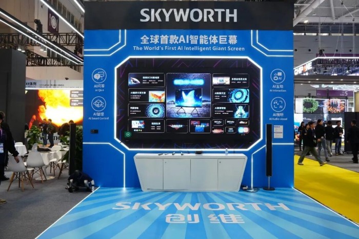 展位现场,由创维创始人黄宏生先生代言的 135吋AI巨幕“老板屏” 成为全场瞩目焦点。它并非一块简单的显示屏,而是集成了AI视听、AI设备、AI内容三大智能体的“智慧核心”。