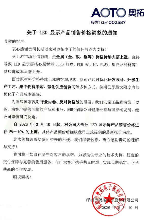 自2026年3月10日起,对公司大部分LED显示屏产品销售价格进行5%一10%的上调,具体产品调价明细以奥拓正式提供的最新报价为准。