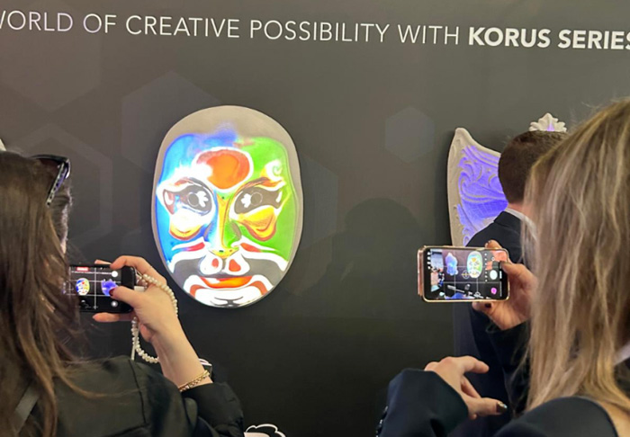 三台 Korus 系列投影机将观众设计的内容投射到面具。"互动性是本项展示的核心,"Mandeep 表示。"这次体验需要参观者参与,而不再是循环播放。每个人都拥有创作的意愿,非专业的艺术创作者也能从创作美好作品的过程中获得乐趣。投影机的实时视觉反馈,让创作得到即时反馈,提升了观众的参与感与停留时间。"