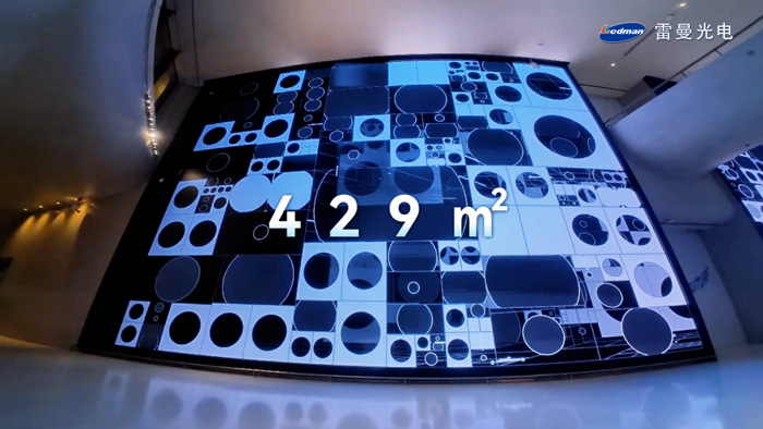雷曼光电为南馆公区提供了两面超高清柔性大屏,总面积达429平方米,以22048*8216的超高总分辨率,完美贴合场馆曲面建筑设计,细腻呈现艺术展品与创意视觉内容,为观众打造沉浸式观展体。