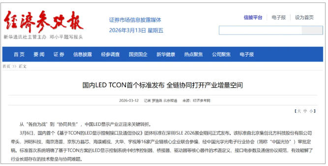 3月6日,国内首个《基于TCON的LED显示控制接口及通信协议》团体标准在深圳ISLE 2026展会期间正式发布。该标准由北京集创北方科技股份有限公司牵头,洲明科技携手十余家国内LED上下游产业链核心企业联合参编,经中国光学光电子行业协会(简称“中国光协”)审批定稿。