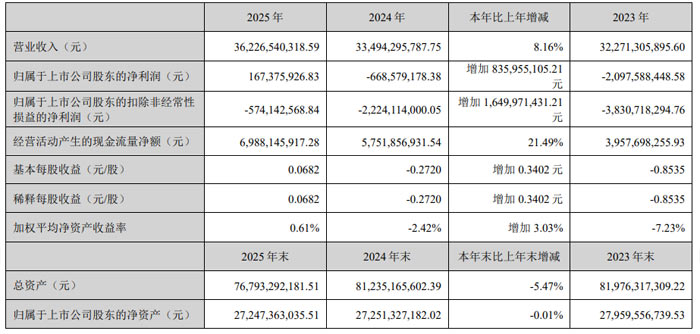2026 年 3 月,天马微电子股份有限公司(股票简称:深天马 A,股票代码:000050)发布 2025 年年度报告。报告显示,公司全年实现营业收入 362.27 亿元,同比增长 8.16%;归属于上市公司股东的净利润 1.67 亿元,同比大幅增加 83.60 亿元,成功实现业绩扭亏为盈;归属于上市公司股东的扣除非经常性损益的净利润为 - 5.74 亿元,同比增加 16.50 亿元,亏损幅度显著收窄;基本每股收益 0.07 元。