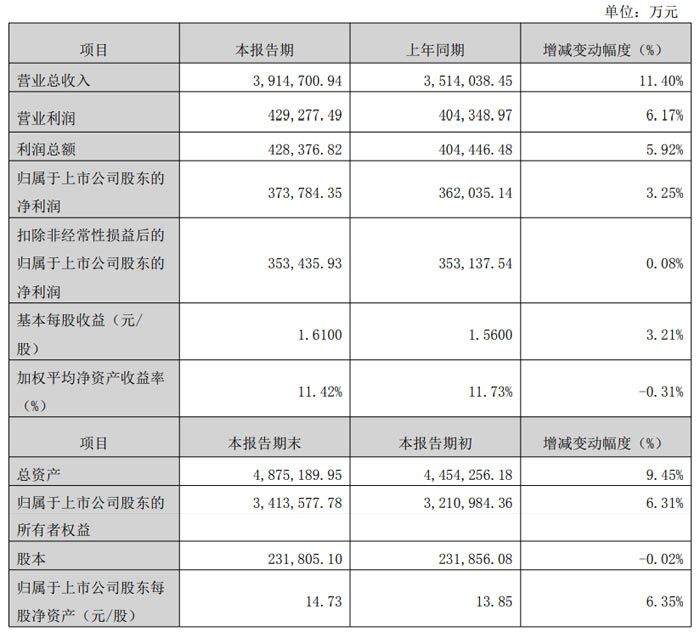 财报数据显示,2025 年公司经营业绩稳步攀升,全年实现营业总收入 391.47 亿元,较上年同期的 351.40 亿元增长 11.40%;营业利润 42.93 亿元,较上年同期的 40.43 亿元增长 6.17%;利润总额 42.84 亿元,较上年同期的 40.44 亿元增长 5.92%。归属于上市公司股东的净利润 37.38 亿元,较上年同期的 36.20 亿元增长 3.25%;扣除非经常性损益后的归属于上市公司股东的净利润 35.34 亿元,较上年同期的 35.31 亿元微增 0.08%。