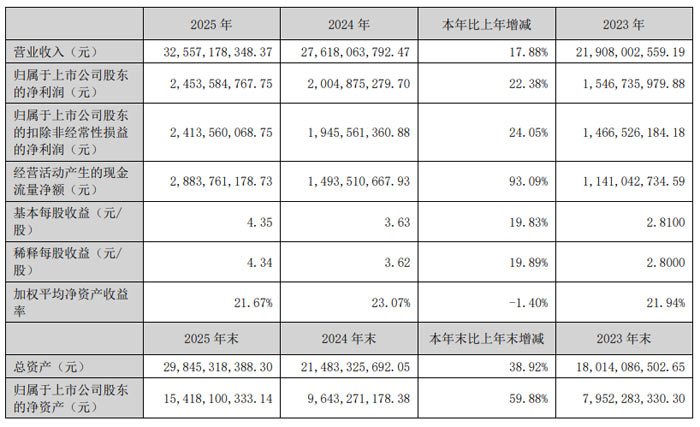 2026 年 3 月,惠州市德赛西威汽车电子股份有限公司(股票简称:德赛西威,股票代码:002920)发布 2025 年年度报告。报告显示,公司全年实现营业收入 325.57 亿元,同比增长 17.88%;归属于上市公司股东的净利润 24.54 亿元,同比增长 22.38%;基本每股收益 4.35 元,同比增长 19.83%,各项核心财务指标均实现稳步提升,彰显了公司在汽车智能化浪潮中的强劲发展韧性。