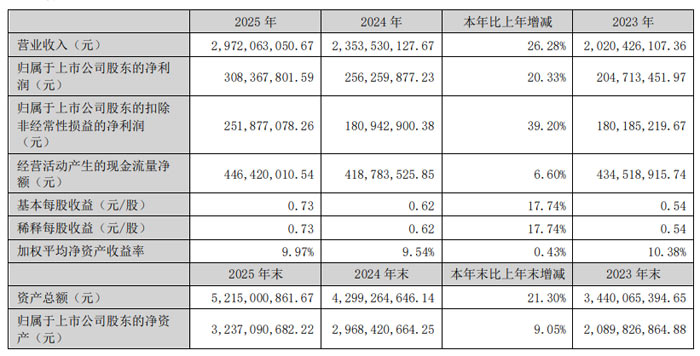 2025 年公司实现营业总收入 34.49 亿元,较上年同期的 30.53 亿元增长 12.97%;期末总资产达 63.50 亿元,较期初的 59.89 亿元增长 6.03%;归母净利润3.06亿元,同降9.96%;归属于上市公司股东的所有者权益为 38.07 亿元,较期初的 37.12 亿元增长 2.56%。