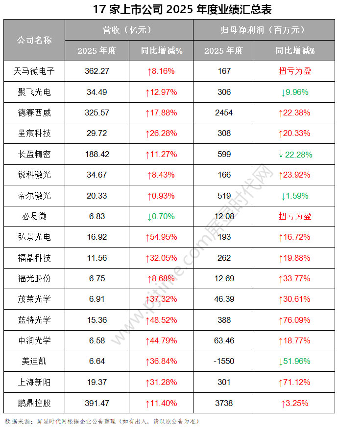 近日,天马微电子、聚飞光电、德赛西威、星宸科技、长盈精密、锐科激光、帝尔激光、弘景光电、福光股份、茂莱光学、上海新阳、鹏鼎控股等17家上市公司发布2025年度财报或业绩快报,业务覆盖半导体、显示面板、汽车电子、激光技术、显示光学等多个核心赛道,全面展现我国科技产业的经营活力与发展韧性。