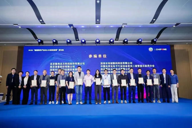 3月6日下午,由中国光学光电子行业协会发光二极管显示应用分会主办,集创北方承办的ISLE2026“新型显示产业与LED标准发展研讨会”圆满举行,并正式发布了《基于TCON的LED显示控制接口及通信协议》团体标准。上海寰视网络科技有限公司作为该标准的参编单位受邀出席会议,公司总经理陈黎平先生上台领取了参编单位证书。