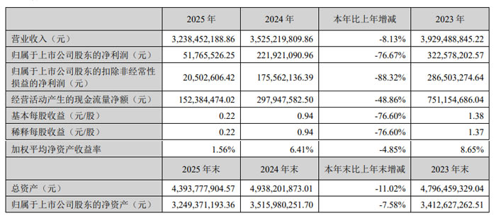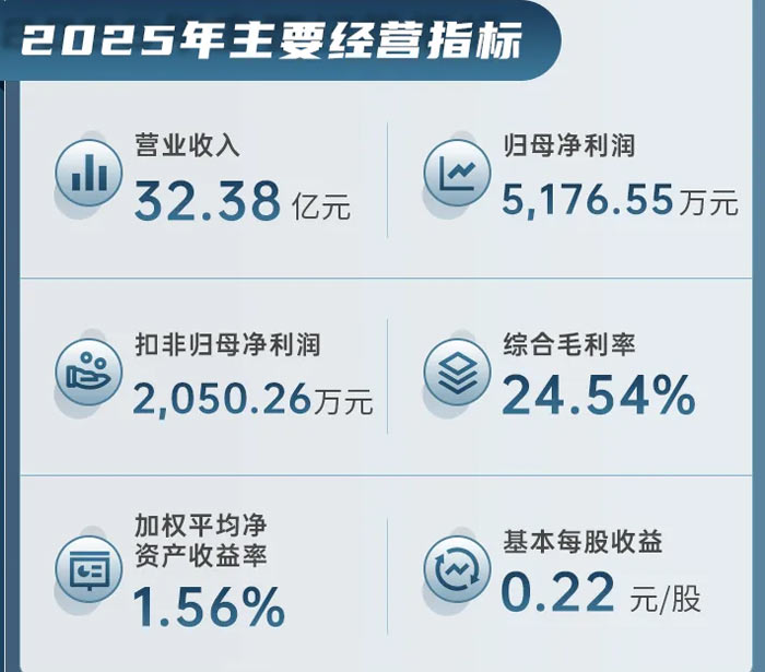 2026 年 3 月 18 日,鸿合科技股份有限公司(股票简称:鸿合科技,股票代码:002955)发布 2025 年年度报告。报告显示,公司全年实现营业收入 32.38 亿元,同比下降 8.13%;归属于上市公司股东的净利润 5176.55 万元,同比下降 76.67%;归属于上市公司股东的扣除非经常性损益的净利润 2050.26 万元,同比下降 88.32%;基本每股收益 0.22 元,综合毛利率 24.54%,加权平均净资产收益率 1.56%。