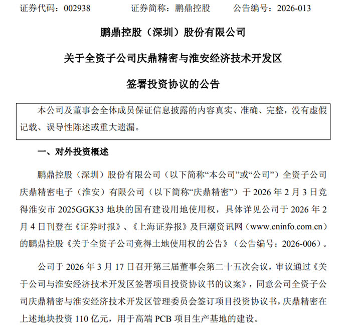 3 月 18 日,鹏鼎控股 (深圳) 股份有限公司(证券代码:002938,证券简称:鹏鼎控股)发布公告称,公司全资子公司庆鼎精密电子 (淮安) 有限公司(下称 “庆鼎精密”)与淮安经济技术开发区管理委员会签署项目投资协议书,拟在淮安竞得的地块上投资 110.00 亿元建设高端 PCB 项目生产基地,抢抓 AI 技术发展浪潮,进一步完善公司高端 PCB 产品生产布局。