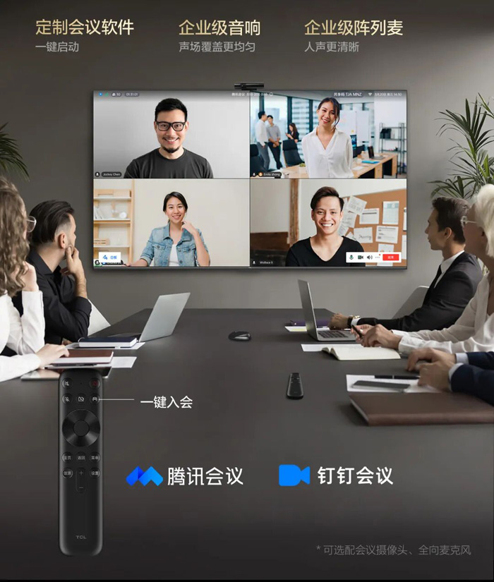 此外,TCL会议电视98E30深度适配腾讯会议Rooms、钉钉会议室等主流平台,针对人声进行专门调校的高保真音响,以及内置多阵列远场麦克风与专属AI降噪算法,带来身临其境的会议体验。标配专属办公遥控器,实现一键开启会议、开启/关闭摄像头和麦克风等功能;使用专属翻页笔,还可以实现PPT翻页、批注、鼠标等功能,全面提升会议效率。