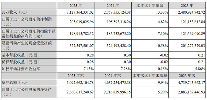 聚灿光电科技股份有限公司(股票简称:聚灿光电,股票代码:300708)2025 年年度报告显示,公司全年实现营业收入 31.27 亿元,同比增长 13.33%;归母净利润 2.05 亿元,同比增长 4.82%;扣非净利润 1.99 亿元,同比增长 7.10%,三大核心财务指标均创同期历史新高,经营业绩稳健增长。