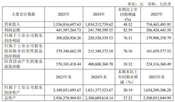 2025 年,星宇股份实现营业收入 152.57 亿元,同比增长 15.12%;利润总额 18.13 亿元,同比增长 13.87%;归母净利润 16.24 亿元,同比增长 15.32%;扣非净利润 15.83 亿元,同比增长 16.29%。