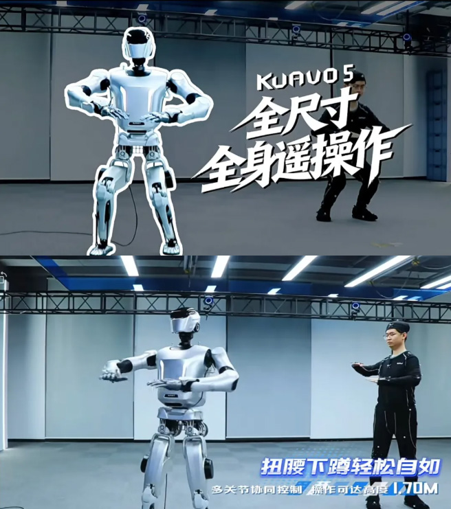 在利亚德虚拟动点数据服务与动捕设备的赋能下,乐聚全尺寸人形机器人实现了真人动作与机器人动作的实时重定向,全身协同控制下,扭腰下蹲等动作自如流畅,全向移动跟随行云流水,展现出高度的灵活性与稳定性。