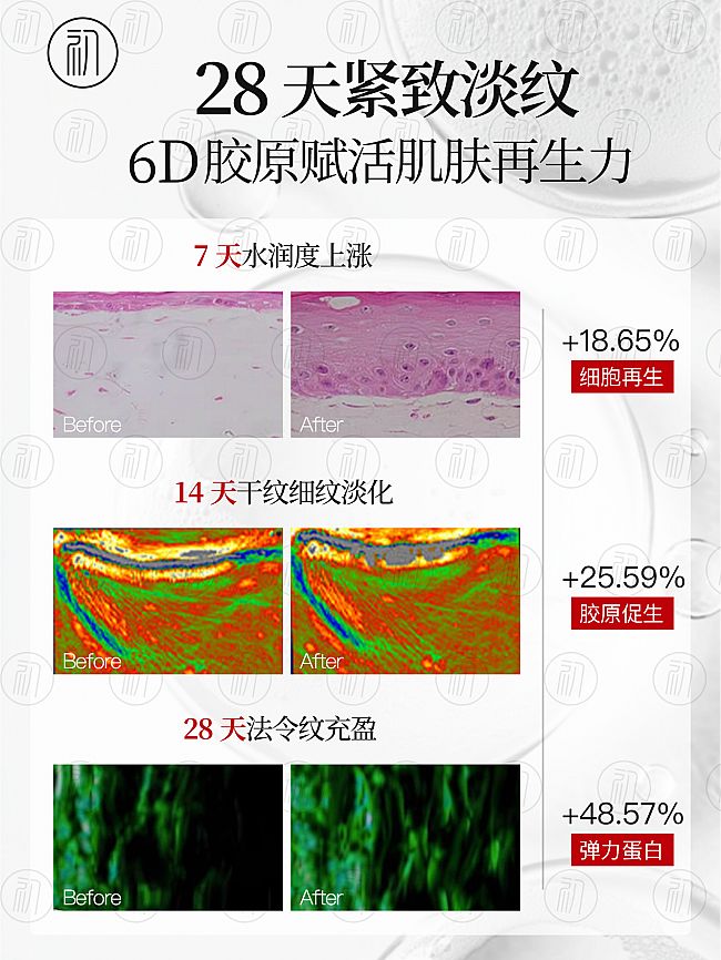 双链路激活,胶原自给自足------专利玻色因+水解胶原,不仅直补更能促生。数据显示,28天后细胞再生率提升18.65%,促生胶原提升25.59%,弹力蛋白提升48.57%,实现外力补充+内力激活的双重保障。