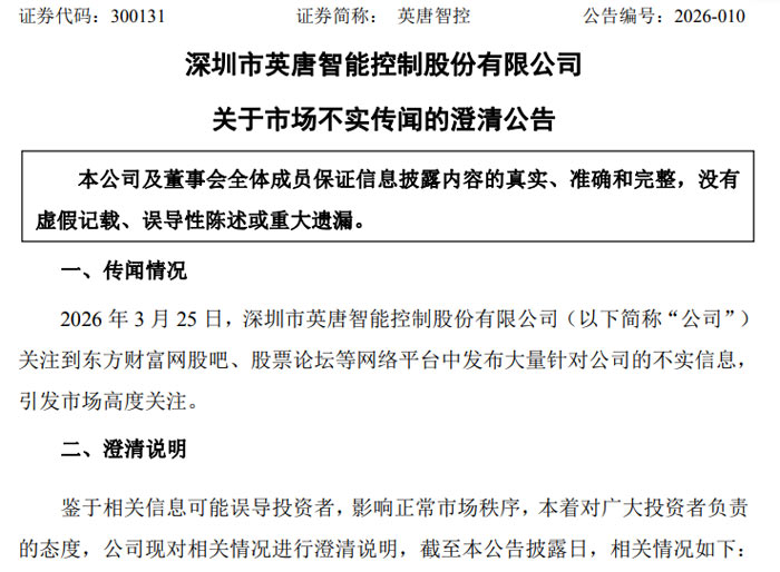 3 月 25 日,深圳市英唐智能控制股份有限公司(证券代码:300131,证券简称:英唐智控)发布关于市场不实传闻的澄清公告,针对近日东方财富网股吧、股票论坛等网络平台出现的相关不实信息予以正式回应,明确相关传闻并无事实依据,同时披露公司并购项目推进、生产经营、业绩预告等核心经营情况,引导投资者理性投资。