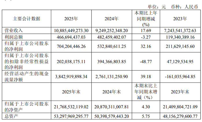 近日,合肥晶合集成电路股份有限公司(股票简称:晶合集成,股票代码:688249)发布 2025 年年度报告。报告显示,公司全年实现营业收入 108.85 亿元,同比增长 17.69%;归属于上市公司股东的净利润 7.04 亿元,同比增长 32.16%;扣除非经常性损益后归属于上市公司股东的净利润 2.02 亿元,同比下降 48.77%;基本每股收益 0.36 元 / 股,同比增长 33.33%。经营活动产生的现金流量净额 38.43 亿元,同比增长 39.18%,整体经营稳健向好。