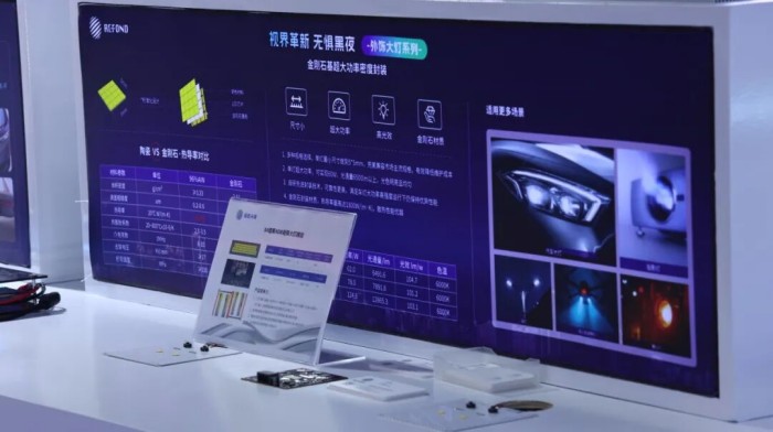 依托自研先进封装技术,瑞丰光电本次展出的金刚石基超大功率密度封装产品,采用5*5mm紧凑尺寸设计,单灯60W高亮稳定输出,解决传统高功率产品光衰大、热导率差等痛点,可满足车用照明对高功率LED的应用需求。