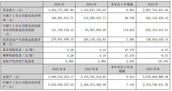 2025 年,蓝黛科技整体经营态势良好,核心财务指标均实现同比增长。公司全年实现营业收入 38.53 亿元,同比增长 8.96%;归属于上市公司股东的净利润 1.85 亿元,同比增长 48.70%;归属于上市公司股东的扣除非经常性损益的净利润 1.41 亿元,同比大幅增长 114.92%;基本每股收益 0.28 元 / 股,同比增长 47.37%。