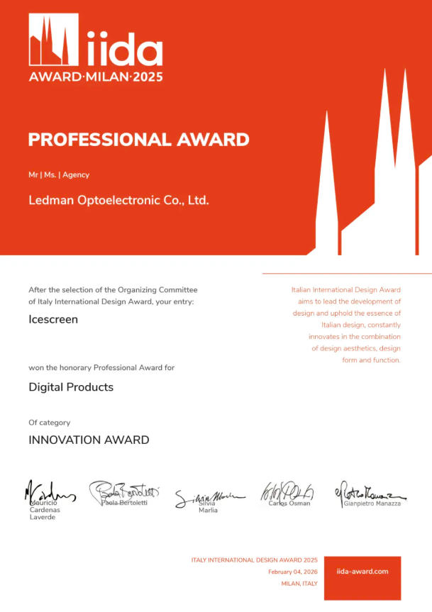 2025意大利IIDA AWARD国际设计大奖获奖名单近日正式揭晓,雷曼光电冷屏大师QS系列凭借卓越设计与创新技术,从全球数十个国家和地区千余件参赛作品中脱颖而出,成功斩获该项国际设计大奖。以中国智造实力,再度在国际设计舞台彰显品牌荣光。