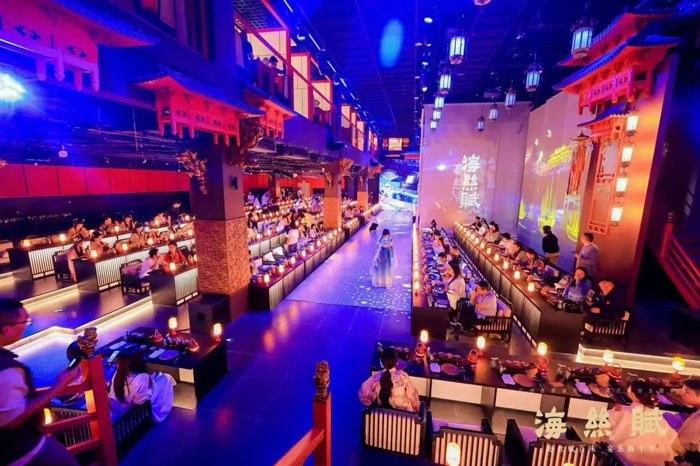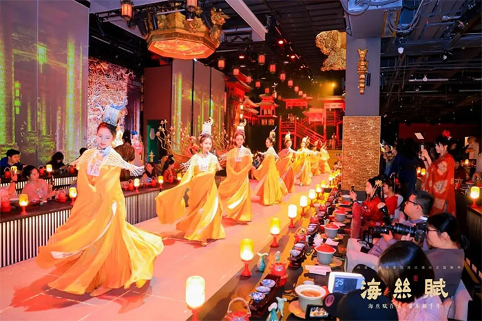 光影流转间,中式殿阁、南洋盛景、异域风华移步换景,千帆过境、万邦相融的繁华盛景在眼前铺陈。舞乐叙事随宴席缓缓推进,演员穿行席间,与宾客共赴一场不落幕的沉浸式传奇。