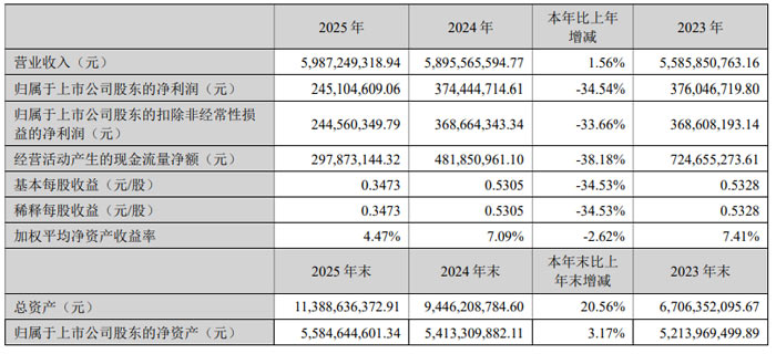 2025 年,莱宝高科实现营业收入 59.87 亿元,较上年同期的 58.96 亿元增长 1.56%;归属于上市公司股东的净利润 2.45 亿元,较上年同期的 3.74 亿元下降 34.54%;归属于上市公司股东的扣除非经常性损益的净利润 2.45 亿元,较上年同期的 3.69 亿元下降 33.66%;基本每股收益 0.35 元 / 股,较上年同期的 0.53 元 / 股下降 34.53%。