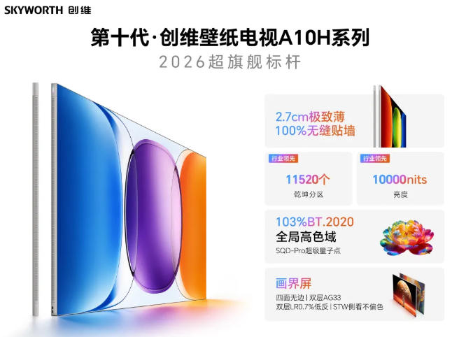 3月11日,创维壁纸电视A10H系列正式发布,以极致纤薄的外观设计和进阶的画质体验,定义2026年创维超旗舰级壁纸电视标杆。近期,创维A10H系列开启预售,预售体验金叠加国补优惠超过2000元,A10H系列预售到手价仅10999元起,A10H Pro预售到手价仅15999元起!让超高端壁纸电视不再是“小众专属”,而是每个人都能轻松入手的“超值之选”。