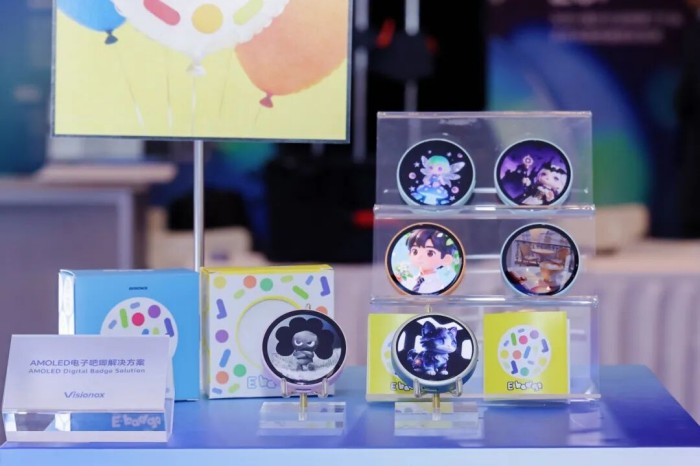 此次亮相的AMOLED电子吧唧,是维信诺面向“谷子经济”推出的新型显示应用。产品搭载1.75英寸AMOLED小圆屏,分辨率466×466,亮度700nits,色域130%,结合蓝牙、NFC、触控和AOD等能力,可实现个性化、社交、互动、装饰四大核心功能。它不仅可以用于图片、动图、小视频展示,还可应用于IP周边、追星应援、动态入场凭证等场景。