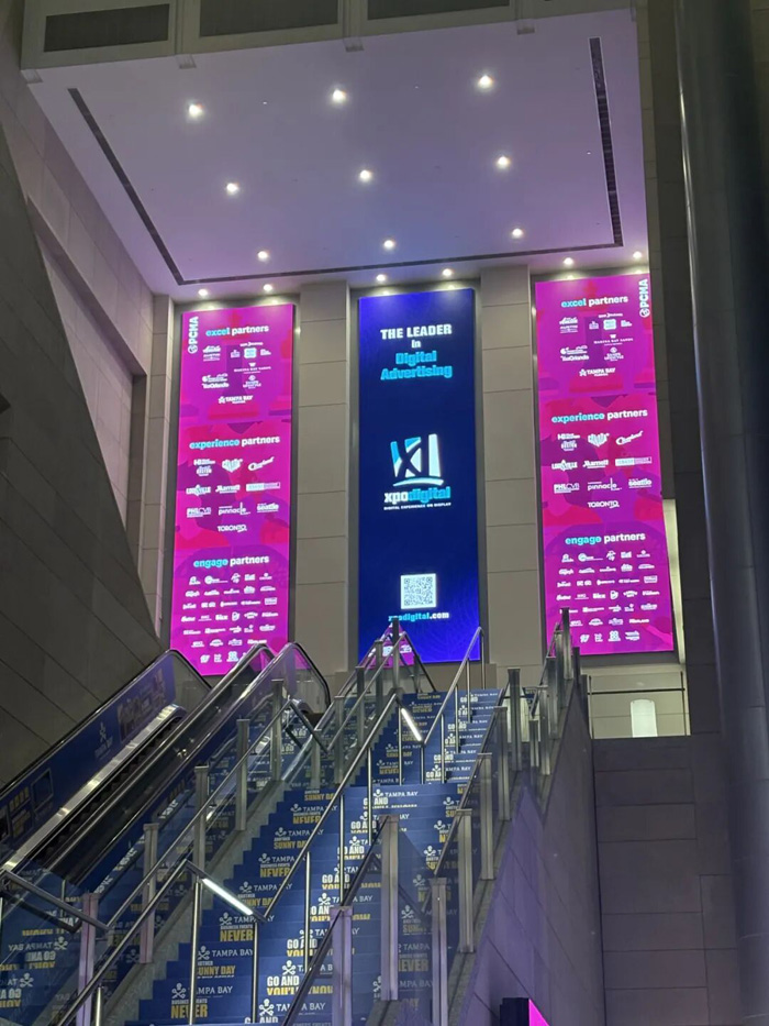 24 米宽幅屏幕坐镇中庭,开启震撼入场体验。三块 8.5米高巨幕纵贯二楼,营造“教堂”般的宏伟视觉;数字信息屏矩阵精准布局在关键路口,实现高效指引。让每位宾客从入场到通行,都能在精准的视觉动线中,领略科技赋能的卓越空间。