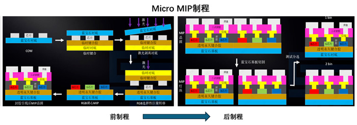 在封装结构上,Micro级MIP沿用倒装芯片+固晶的方案,通过“预封装”方式,将微米级芯片通过先进封装制程(蓝宝石LLO+巨量转移+RDL)整合为结构稳定、尺寸更大的MIP封装体,简化后段制造流程,并解决返修、良率和产线兼容性等痛点。