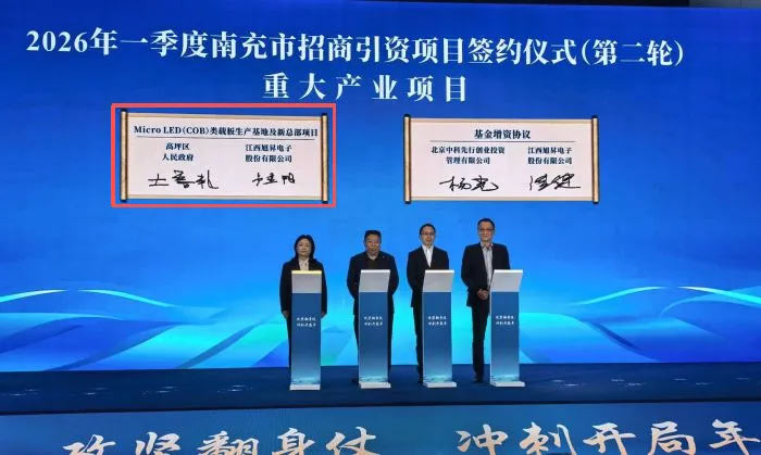近日,四川南充市举行2026年一季度招商引资项目签约仪式,现场集中签约项目15个,协议总投资达131.5亿元。其中,旭昇电子Micro LED显示COB封装类载板生产基地项目正式签约落户南充高坪区,以55亿元总投资成为南充2026年开年以来引进的投资规模最大的产业项目。