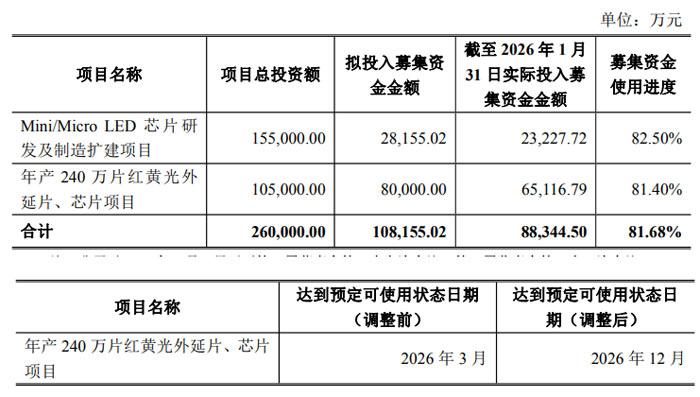 其中,年产 240 万片红黄光外延片、芯片项目总投资为10.5亿元,拟投入募集资金8亿元。公告显示,截至2026年1月31日,年产 240 万片红黄光外延片、芯片项目已累计投入募集资金约6.51亿元,投资进度为81.40%。