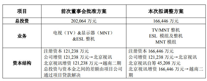 2026 年 3 月 31 日,京东方科技集团股份有限公司(证券代码:000725、200725,证券简称:京东方 A、京东方 B)发布公告称,为顺应国际政策与市场环境变化,优化项目效益、控制投资风险,公司董事会审议通过对越南整机二期项目方案进行调整,项目总投资由原 20.21 亿元调减至 16.64 亿元,同时优化业务布局与资本结构。