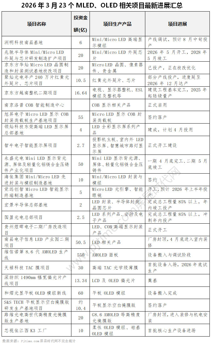 2026年3月份,洲明科技、兆驰半导体、华灿光电 、聚灿光电、京东方、海佳集团、维信诺、深纺织、路维光电、芯视佳等23大Mini/MicroLED、OLED相关项目传来最新进展动态,涉及签约落户、开工奠基、设备进场、设备调试、投产、项目延迟调整等多个节点。涉及总投资金额超过950亿元人民币。
