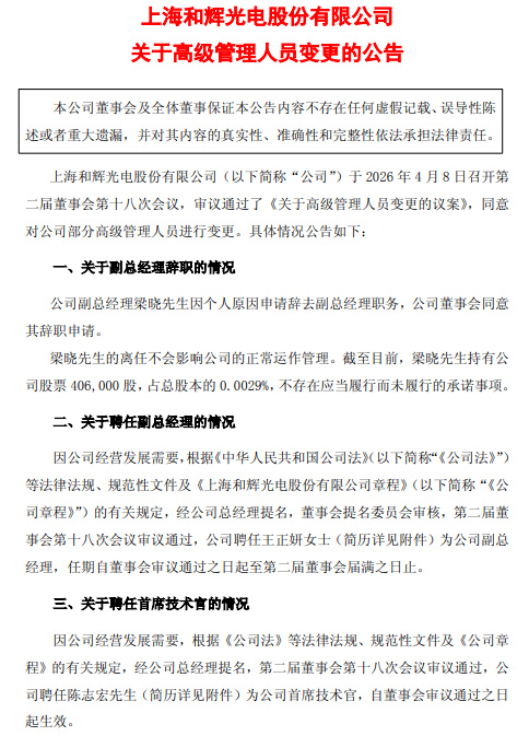 2026年4月8日,和辉光电(688538)发布公告,决定对部分高级管理人员进行变更。公告显示,副总经理梁晓因个人原因辞职。同时,公司聘任王正妍为副总经理,任期至第二届董事会届满,公司还聘任陈志宏为首席技术官。