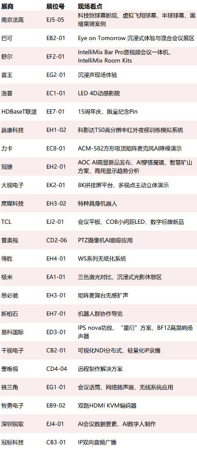 您将结识invidis consulting、Valens、千视电子、TruSound、新加坡E&E、加拿大GSM Project、科大讯飞、声网、顶力科技、国体智慧体育技术创新中心、爱普生光影研究院、冠捷、QSC、Netgear等来自数字标牌、沉浸式文旅、智慧教育、智慧办公、情绪经济新业态(潮玩/宠物/疗愈/非遗)等领域的品牌方、场景运营方、系统集成商、内容创意机构及咨询公司代表。