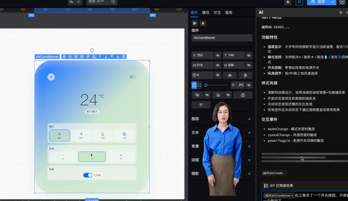 小鸟科技AI中控对话式编程解决方案,利用AI技术实现了对项目内设备、界面及自动化调配,AI 可自动生成标准化的驱动模型 , 降低了接入 设备对接 难度,确保了数据的精准互通。 打破传统 控制界面绘制逻辑 , AI 能够根据 描述自然语言 生成对应的界面组件,将重复性的美工与绑定工作交由算法完成, 降低用户成本, 缩短了工程交付周期。