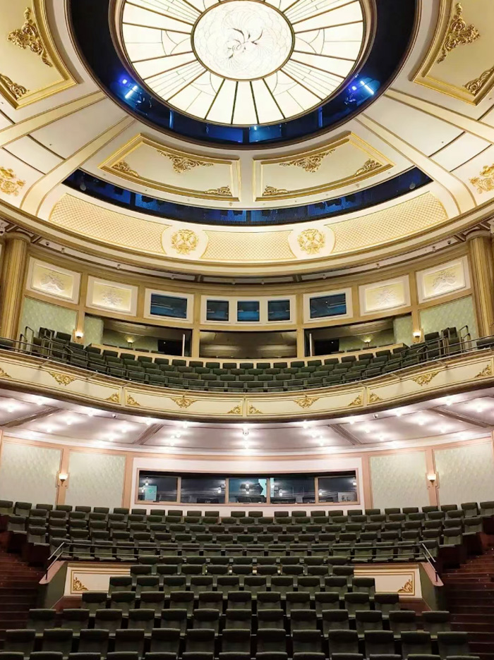 声学上,场馆打造沉浸式全景扩声体系,151个扬声器科学布局,天花效果声扬声器数量为传统方案的三倍,实现全域声音包裹感,精准还原声源,让每个座位都有同等震撼、干净的听觉体验。