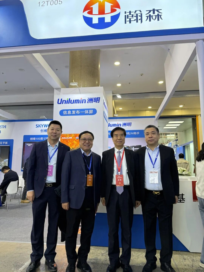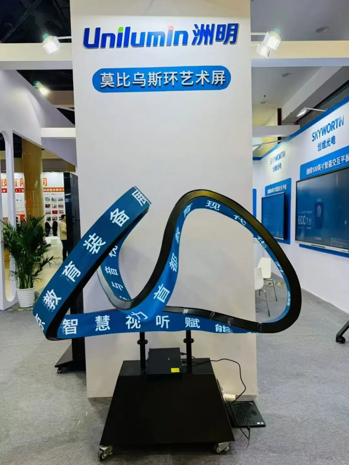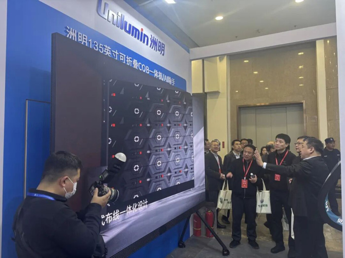 震撼的视觉冲击、无缝拼接的巨幕效果,让校园信息发布、大型活动、学术报告厅焕发全新活力。本次展会,我们隆重带来了 洲明135英寸可折叠超薄一体机——全球首发 的明星产品!它集可折叠、超薄轻便、高清显示于一身,彻底解决了传统LED运输难、安装繁的痛点,为教育场景提供了前所未有的灵活大屏解决方案。领导们亲临体验后,对产品的稳定性、色彩还原度及低蓝光护眼特性给予了充分肯定,尤其对“全球首发”的创新意义赞不绝口。