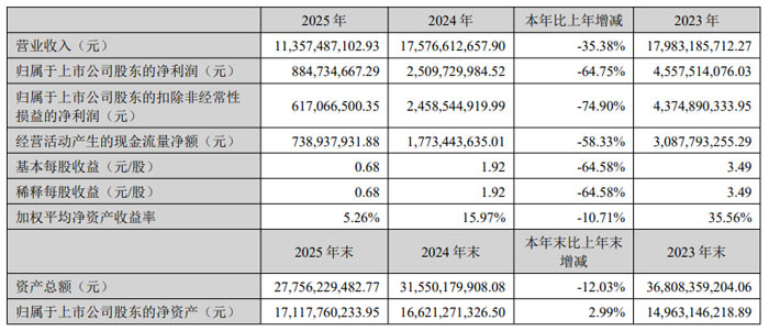 2025 年,晶盛机电实现营业收入113.57 亿元,同比下降 35.38%;归属于上市公司股东的净利润8.85 亿元,同比下降 64.75%;扣除非经常性损益后的净利润6.17 亿元,同比下降 74.90%;经营活动产生的现金流量净额7.39 亿元,同比下降 58.33%。