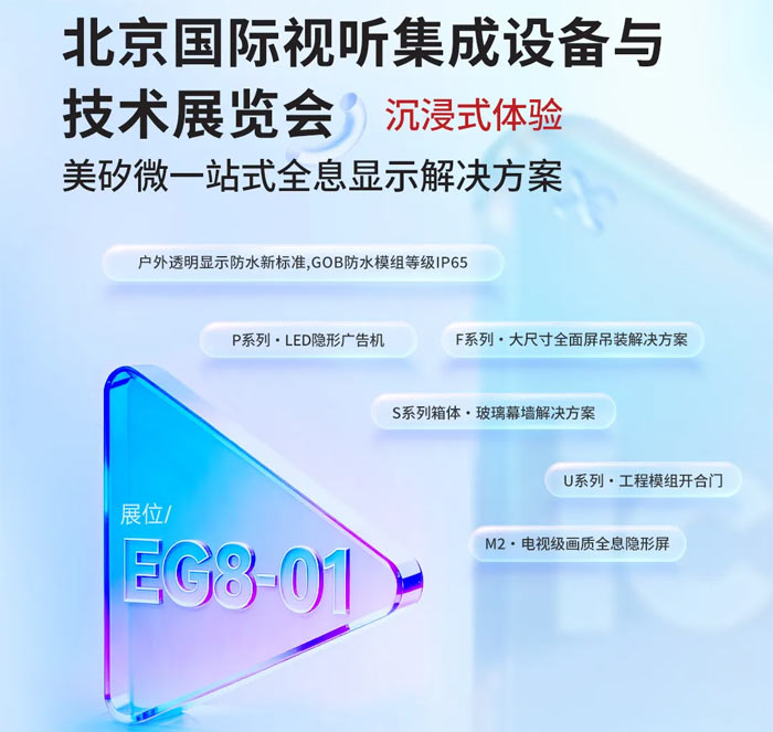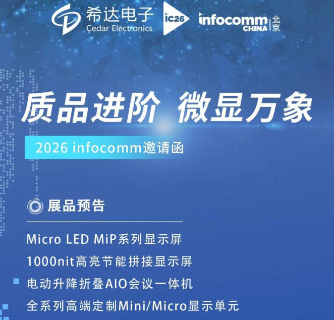 主要展品包括、Micro LED MiP 系列显示屏、1000nit 高亮节能拼接显示屏、电动升降折叠 AIO 会议一体机、全系列高端定制 Mini/Micro 显示单元等。